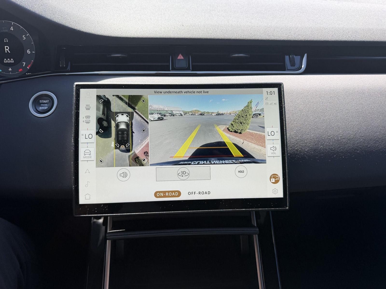 - The vehicle is equipped with a camera that displays an image of the area behind the vehicle on an interior display.